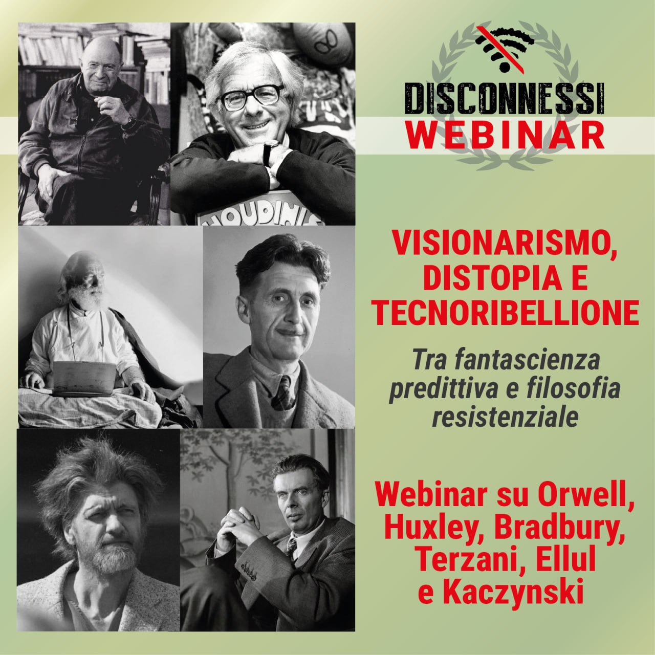 Con il Disconnessi webinar potrai acquisire dimestichezza con alcune delle figure più importanti e controverse. Rileggeremo in controluce le maggiori opere di George Orwell e Aldous Huxley insieme alle sceneggiature avveniristiche di Ray Bradbury. Ci imbatteremo nelle denunce e teorie del giornalista Tiziano Terzani e del sociologo Jacques Ellul, conoscendo da vicino la controversa figura del genio matematico Theodore John Kaczynski.