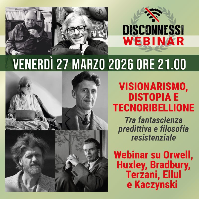 Il futuro che prima non c’era nella visione di profezie distopiche e nella resistenza umana del Terzo Millennio, dove il cambiamento radicale nella società civile sta al grande controllo tecnototalitario così come la trasformazione antropologia della specie sta alla mutazione di stili di vita digitalmente eterodiretti. C’è chi attacca e chi difende, perché? Qual è lo scontro in atto? Tra ultra-modernismo e tradizione sapienziale, dalla narrazione alla predizione, cercheremo di fare luce sull’attuale momento storico, passando in rassegna alcuni tra i maggiori intellettuali, filosofi, pensatori e autori di scenari futuribili nell’applicazione di politiche di ingegneria sociale, di denuncia sistemica e critica alla società industriale come arma di annichilimento dell’umanità. Il secondo Disconnessi webinar sarà un laboratorio sperimentale di riflessione e approfondimento senza eguali.